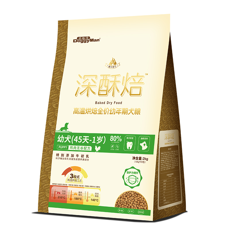 深酥焙 高温烘焙全价幼年期犬粮/适用对象:幼犬(45天-1岁)/口味:鸡肉无谷配方/核心卖点:自护力提升/0谷物、0肉粉、0人工合成诱食剂/其它卖点:骨牙发育&脑眼发育 2KG正装